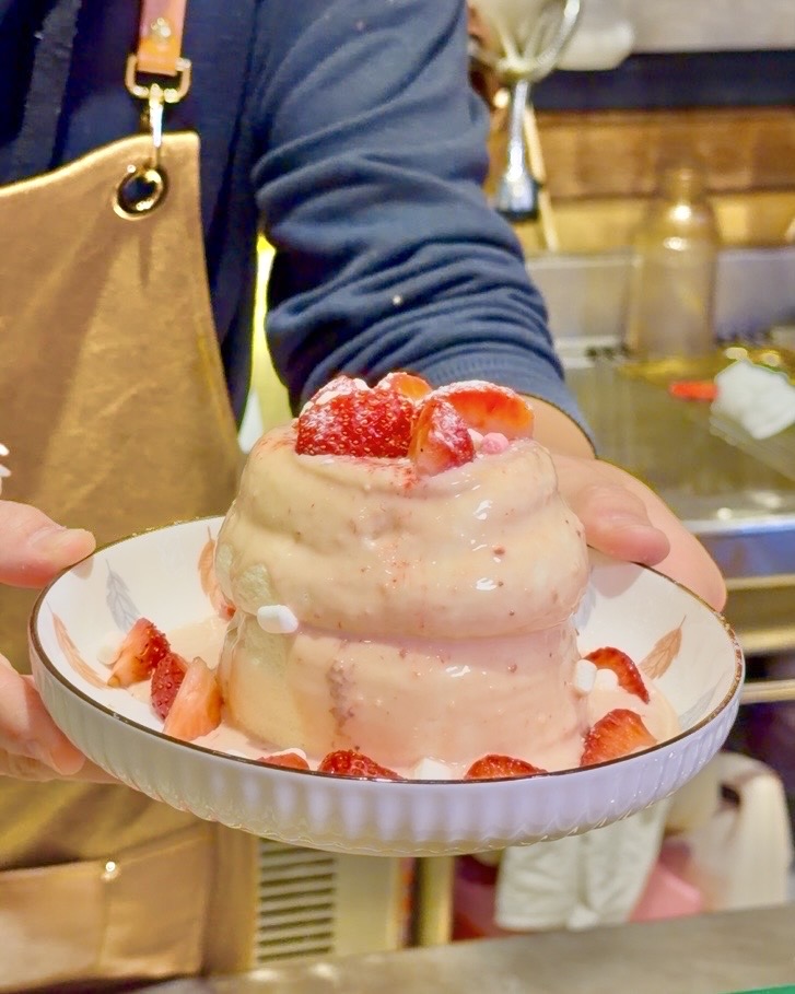 鬆軟綿密的舒芙蕾,淋上限定的草莓卡士達醬,