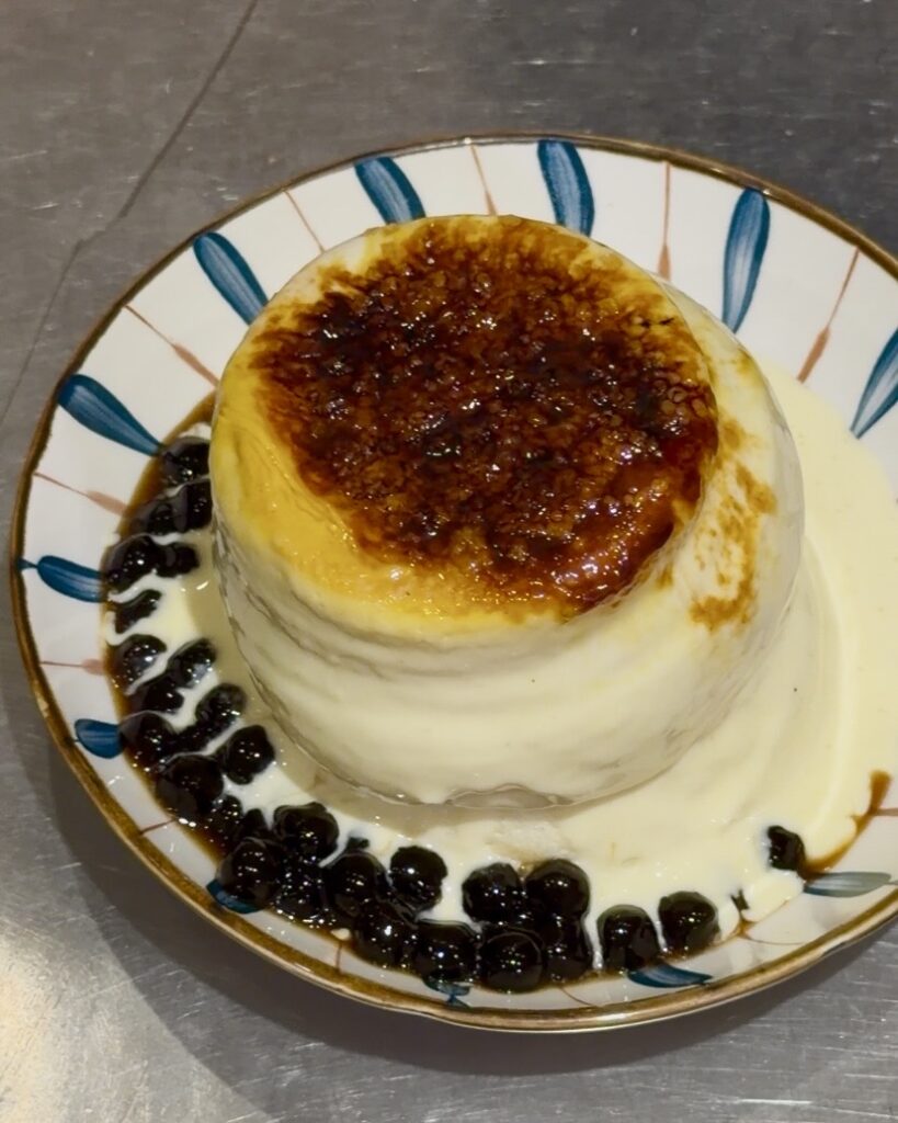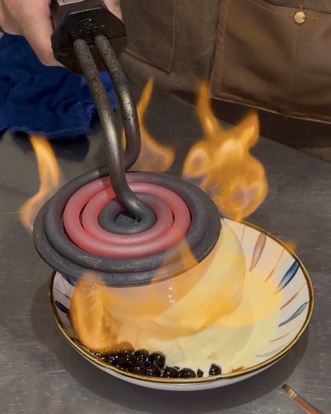 炙燒原味舒芙蕾 則是會在卡士達醬表面灑滿糖粉,現場3秒炙烤超吸睛!
